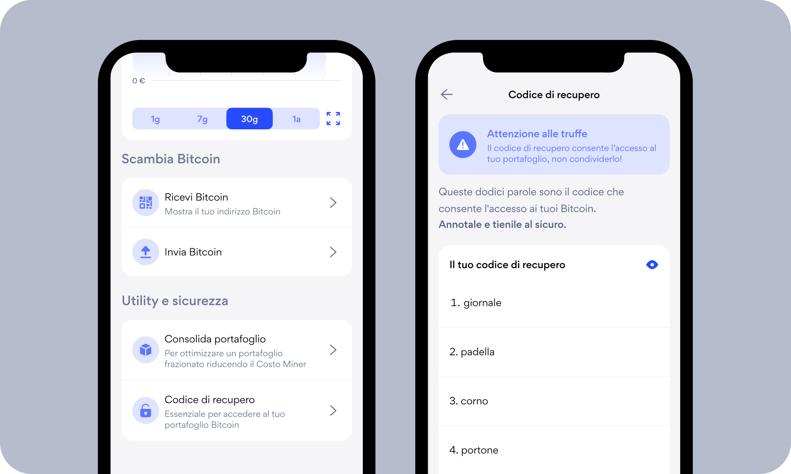 Il codice di recupero è il codice di sicurezza, personale e segreto, fondamentale per recuperare i Bitcoin presenti sul tuo portafoglio. È composto da 12 parole segrete, disposte in ordine numerico, che trovi nella schermata principale della sezione Bitcoin alla voce "Codice di recupero".