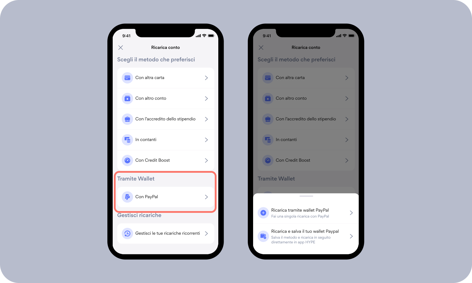 Il servizio di ricarica conto tramite Wallet PayPal è disponibile nella sezione Ricarica conto, presente nella Home dell’app HYPE, e permette di scegliere se effettuare una ricarica singola (Ricarica tramite PayPal) o effettuare una ricarica singola e al contempo salvare il tuo Wallet per future operazioni (Ricarica e salva il tuo Wallet).